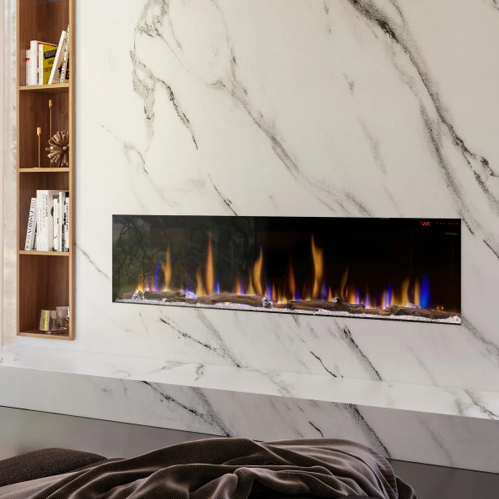 - Media Accent Color/Top Light – Customize the fireplace interior by adjusting the media bed and top light – select from a range of preset colors or scroll through Prism mode and freeze on your favorite look.