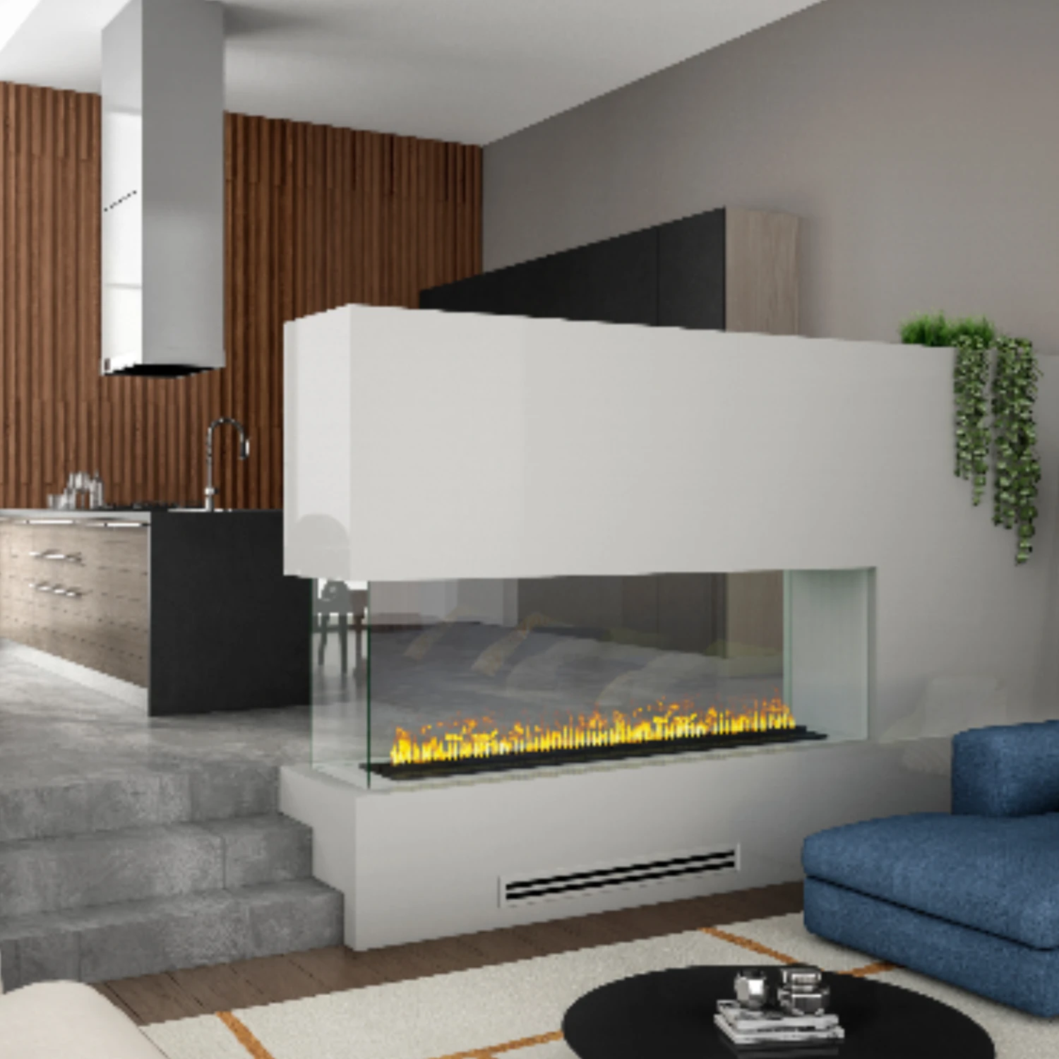 Picture the perfect fireplace: any length, any location, and any number of sides. Forget about venting, gas lines, and hot glass, because they are a thing of the past. Now imagine flames made of water that you can reach out and touch. The revolutionary Opti-myst by Dimplex reinvents the electric fireplace and makes it easier than ever to add a dramatic fire feature to any space. See-through, three-sided, open concept, the possibilities are endless, so go ahead, play with fire.