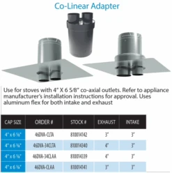 Co-Linear Adapter for use with appliances with 4” X 6 5⁄8” co-axial outlets. Comes pre-painted in black for use with free-standing stoves. Where desired, the 46DVA-DC Ceiling Support / Wall Thimble Cover can also be used as décor trim. Refer to appliance manufacturer’s installation instructions for approval. Uses aluminum flex for both