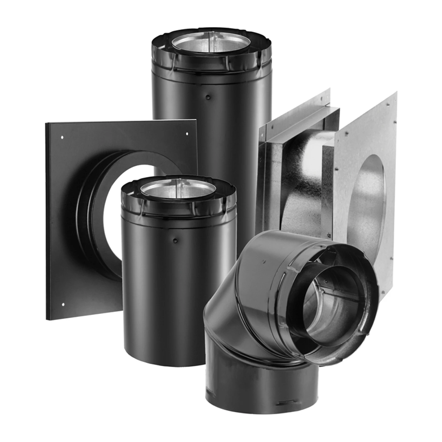 Kit includes: 90° black Elbow, Wall Thimble, Ceiling Support/Wall Thimble Cover, 24″ black Pipe, 8 1/2″ black Pipe Extension. Termination cap not included. For 4″ x 6 5/8″ direct vent.