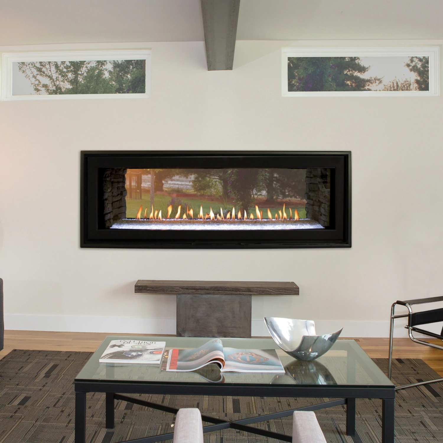 The new Boulevard 48 Direct-Vent See-Through fireplace features a true 48-inch viewing area, fully recessed burner, and white LED under floor lighting. This system installs in an interior wall to brighten adjoining rooms – or in an exterior wall with the optional stainless steel outdoor kit for a beautiful view, indoors and out. Customize the look with liners, logs, fronts, and decorative glass.