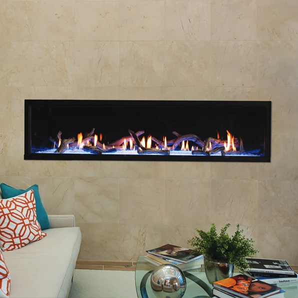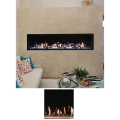 Tailor the Boulevard fireplace to suit your taste, starting with an elegant porcelain black liner that goes well with any decor or opt for an industrial chic look with the Ridgeback liner – a one-piece corrugated metal liner finished in distressed bronze. The fully recessed burner fills the fireplace with lively flames- up to 52,500 Btu (Nat)/50,000 Btu (LP) for the DVLL72. The Boulevard 72 (52,500 Btu Nat and 50,000 Btu LP) comes with an additional wall-mounted two-summary control to operate the stunning multi-color LED lighting system. Style your fireplace with crushed glass only, or add one of two available log sets- the contemporary Driftwood set or the traditional Rustic set of logs, rocks, and coils.