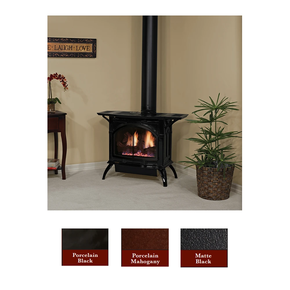 Direct-Vent Empire Cast Iron Medium Stove includes Empire’s Slope Glaze Burner system with expanded ember bed for extra glow. Ceramic beads within the burner swirl and tumble the gas to create naturally swirling flames that are indistinguishable from a wood fire. Topped off with the hand-painted ceramic fiber log set and glowing embers, the effect is stunningly realistic and guaranteed to keep you and your guests mesmerized for hours.