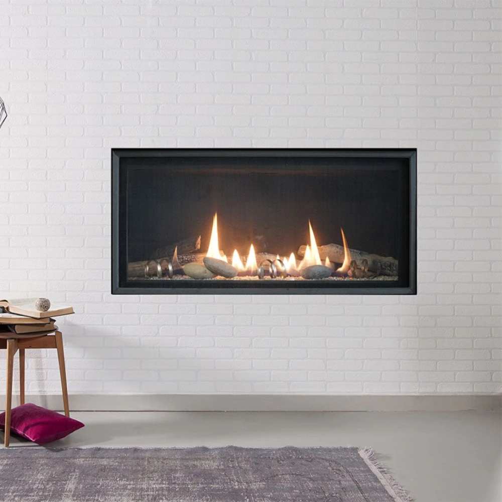The Loft brings a contemporary linear style to homes or offices, offering exceptional value. Its design features a long, flickering flame amid crushed glass media. Available in 36” and 46” models, it suits various spaces. Control options range from simple millivolt to multifunction remote-controlled electronic ignition. Personalize the fireplace with different media choices to match any space.