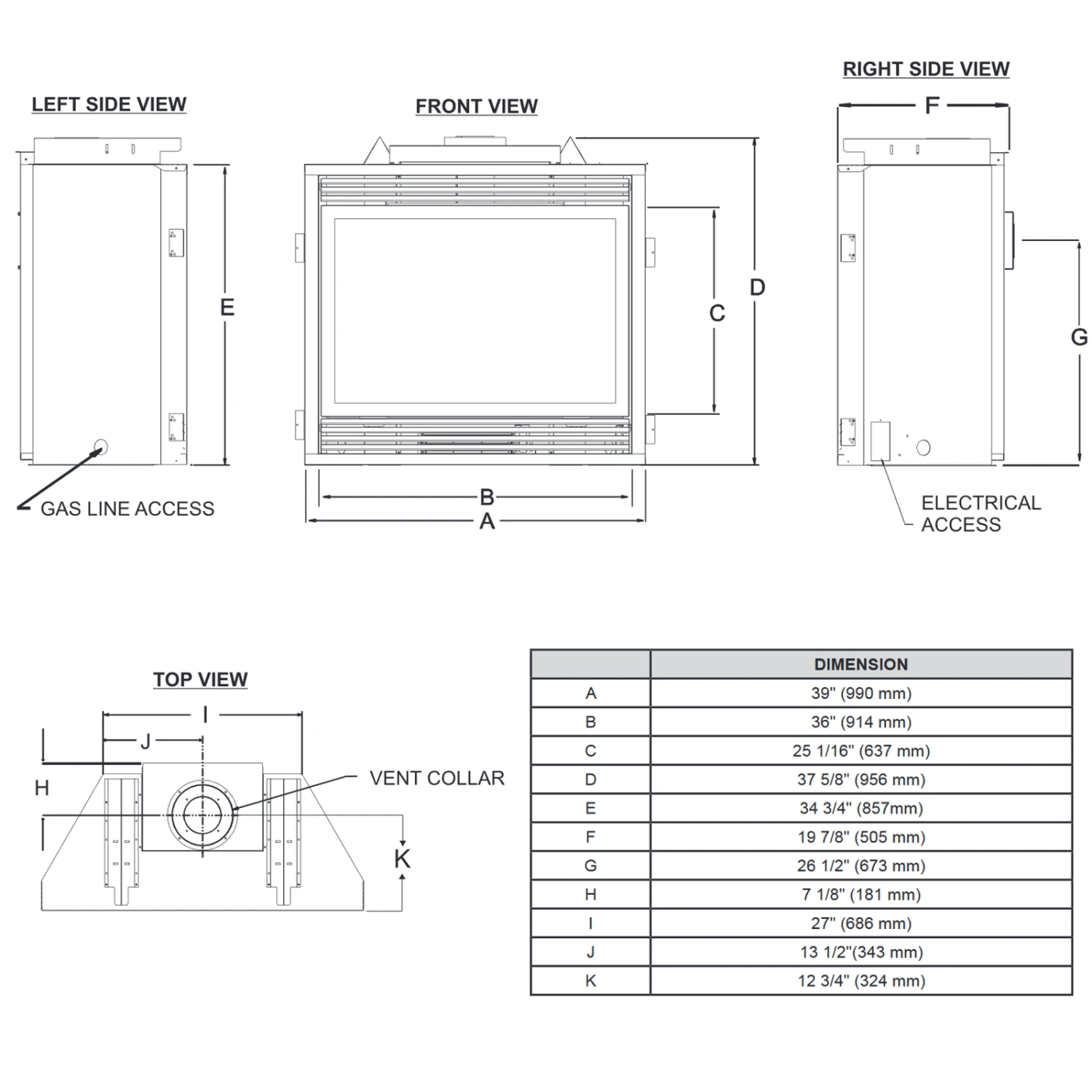Tahoe Premium 36 Fireplace includes a tempered glass view window and a four-piece log set, mounted atop our legendary Slope Glaze Burner for a rich flame pattern within a taller, deeper log stack that complements the deeper fireplace.