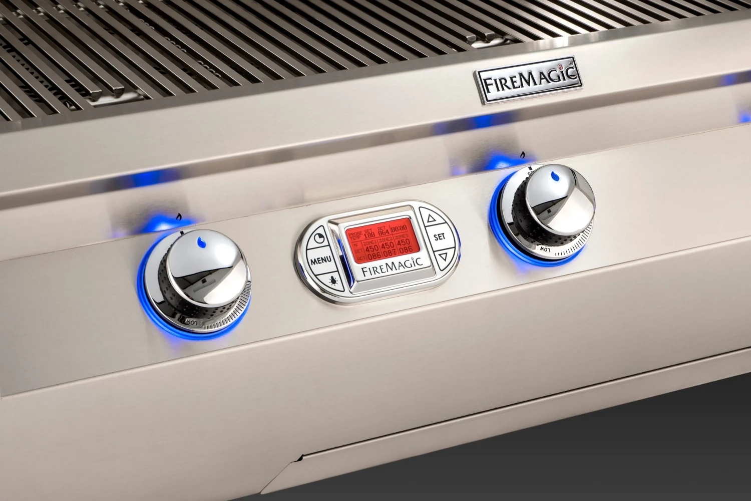 - Digital chrome meat & grill thermometer in control panel measuring up to 1000º F