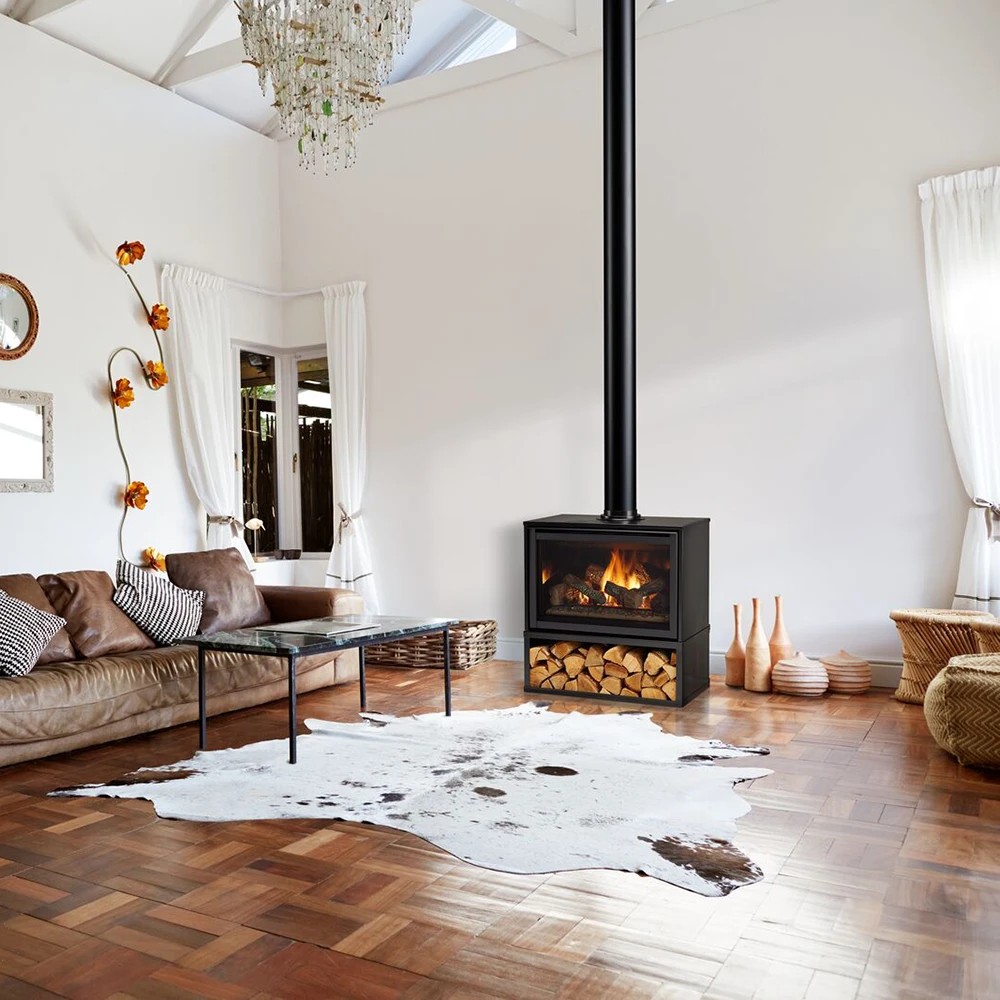 Experience the ultimate in cozy comfort with the Trilliant freestanding gas fireplace. Its Canyon Brown interior panels and captivating accent lights create an instantly relaxing ambiance. Direct Vent technology efficiently expels fumes and exhaust. IntelliFire Touch remote options include a smart speaker, remote, or wall switch. The standard heat exchanger and variable-speed fan swiftly distribute warmth, while a battery backup ensures unwavering coziness during winter power outages.