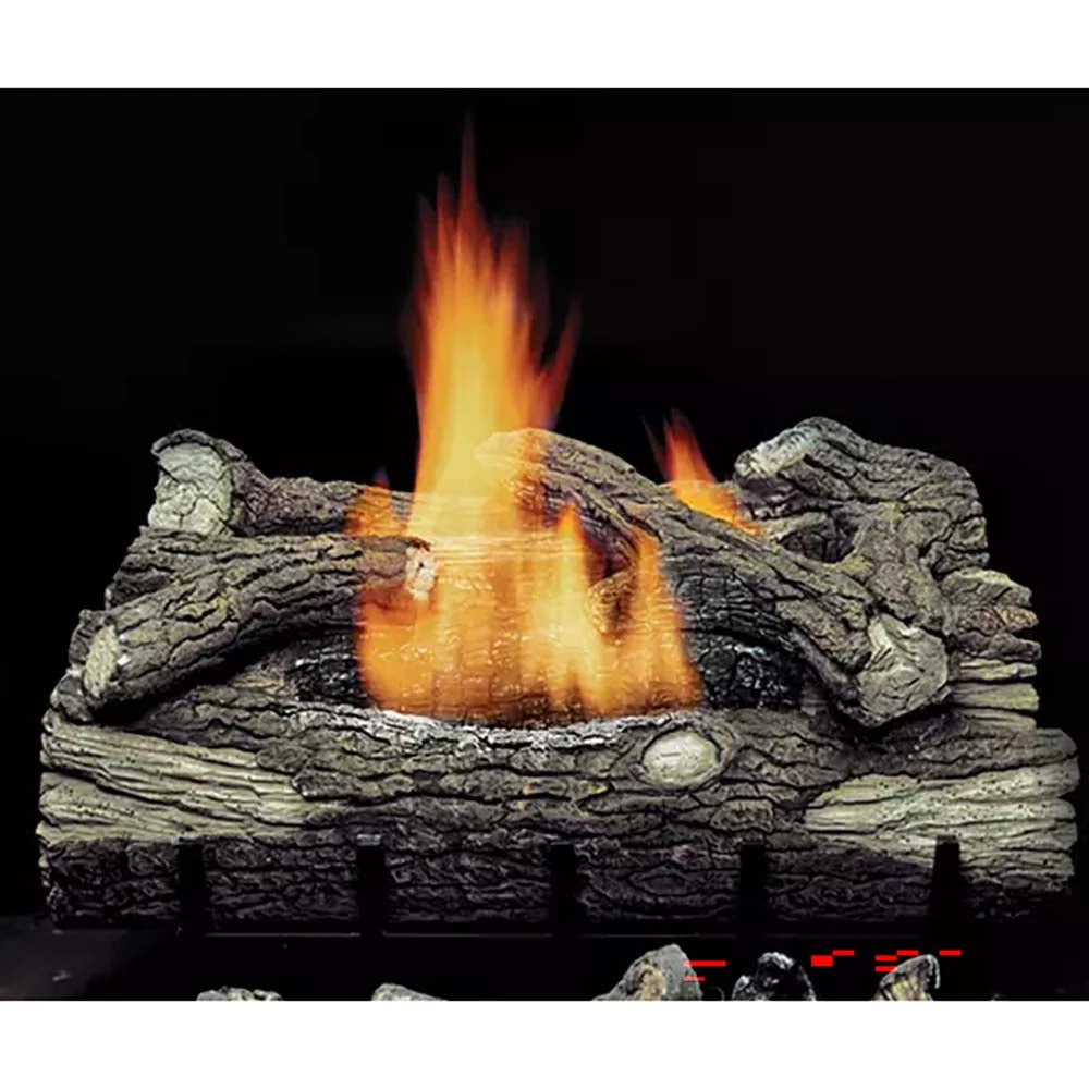 Experience the charm of a Monessen log set with hand-painted logs that authentically replicate bark, firewood grain, and charring for a rustic fireside ambiance. This log set features a double yellow flame burner system, a heavy grate assembly, and your choice of a variable manual control valve or millivolt control valve equipped with an on/off switch and variable flame height control. The inclusion of volcanic rock adds to the natural appeal.