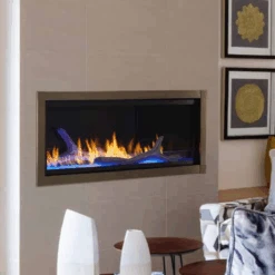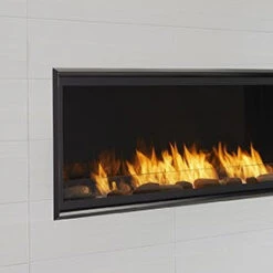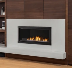 Heat can be beautiful. The sleek look of this linear fireplace can be added nearly anywhere, warming your home with 99.9 percent efficiency. The final touches are the shimmering fireglass and accent lighting that transform this sleek fireplace into an eye-catching show.