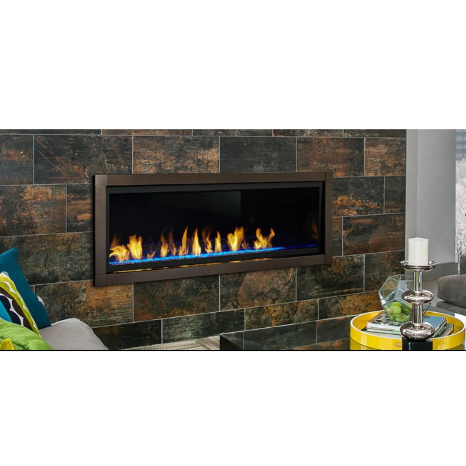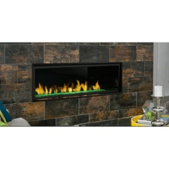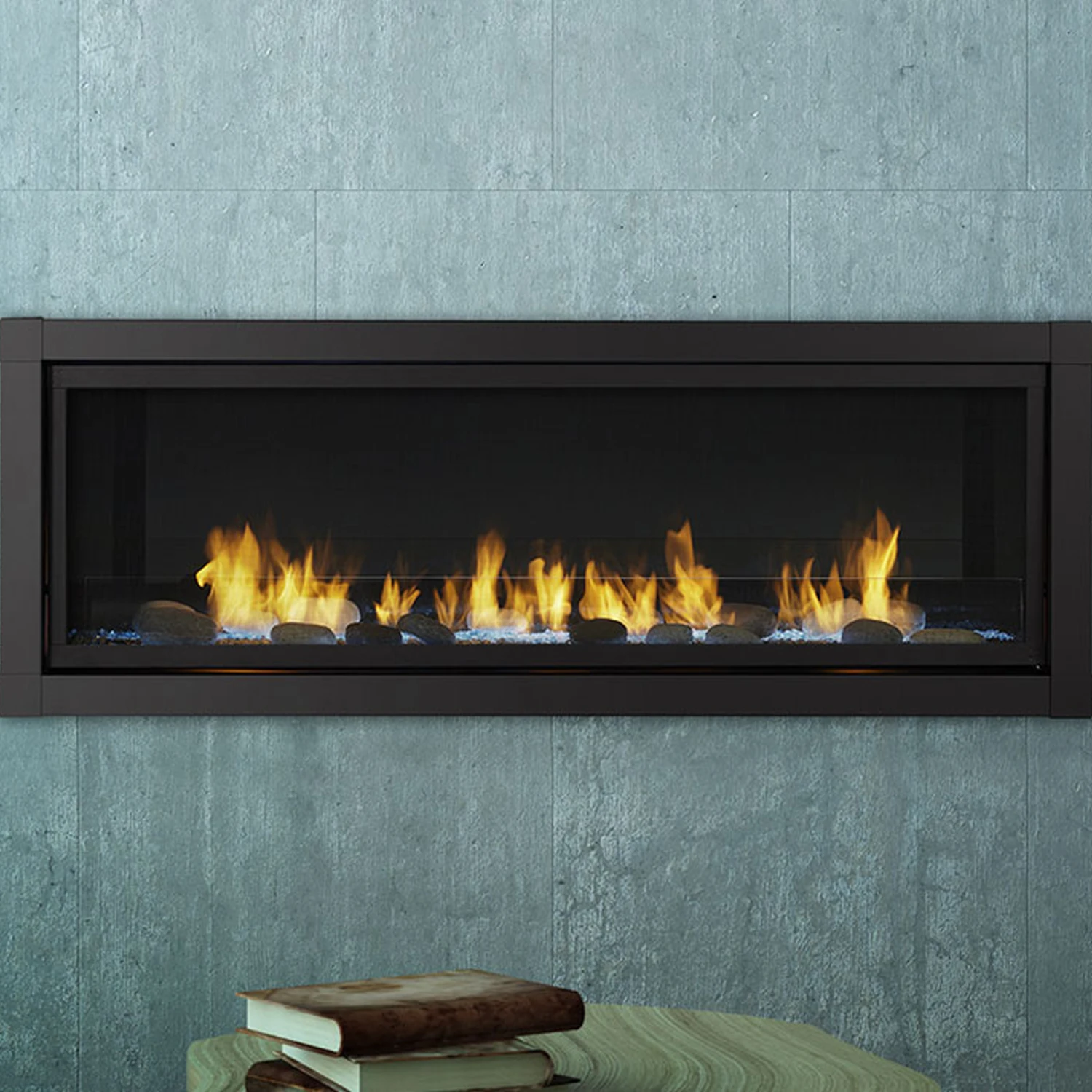Heat can be beautiful. The sleek look of this linear fireplace can be added nearly anywhere, warming your home with 99.9 percent efficiency. The final touches are the shimmering fireglass and accent lighting that transform this sleek fireplace into an eye-catching show.