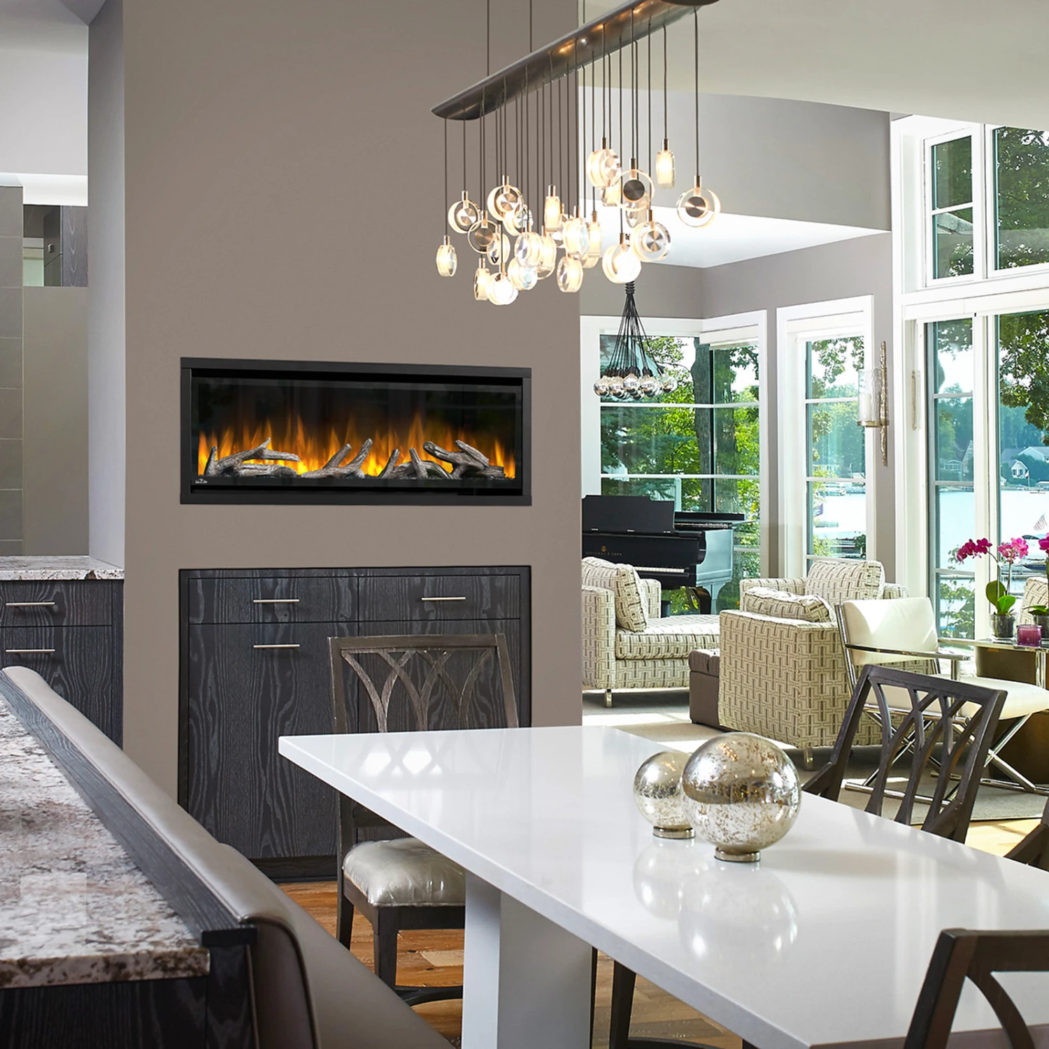 See the fireplace, not the frame with Napoleon’s Alluravision 42 Deep linear electric fireplace. It stands out from the rest with the nearly frameless viewing area which highlights the unique flame colors. Set the mood with yellow, orange, blue and multicolor flames with the push of a summary. Easy to use, this electric fireplace is plug and play – just hang on the wall and plug it in. The Alluravision 42 Deep can also be hardwired to 120V for a 5,000 BTU output or 240V for a 9,000 BTU output. Comes standard with a crystal media ember bed and remote control. Napoleon’s Alluravision Series linear electric fireplaces are about adding the fireplace, and not the frame to your favorite room.