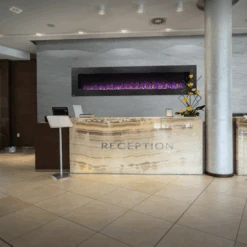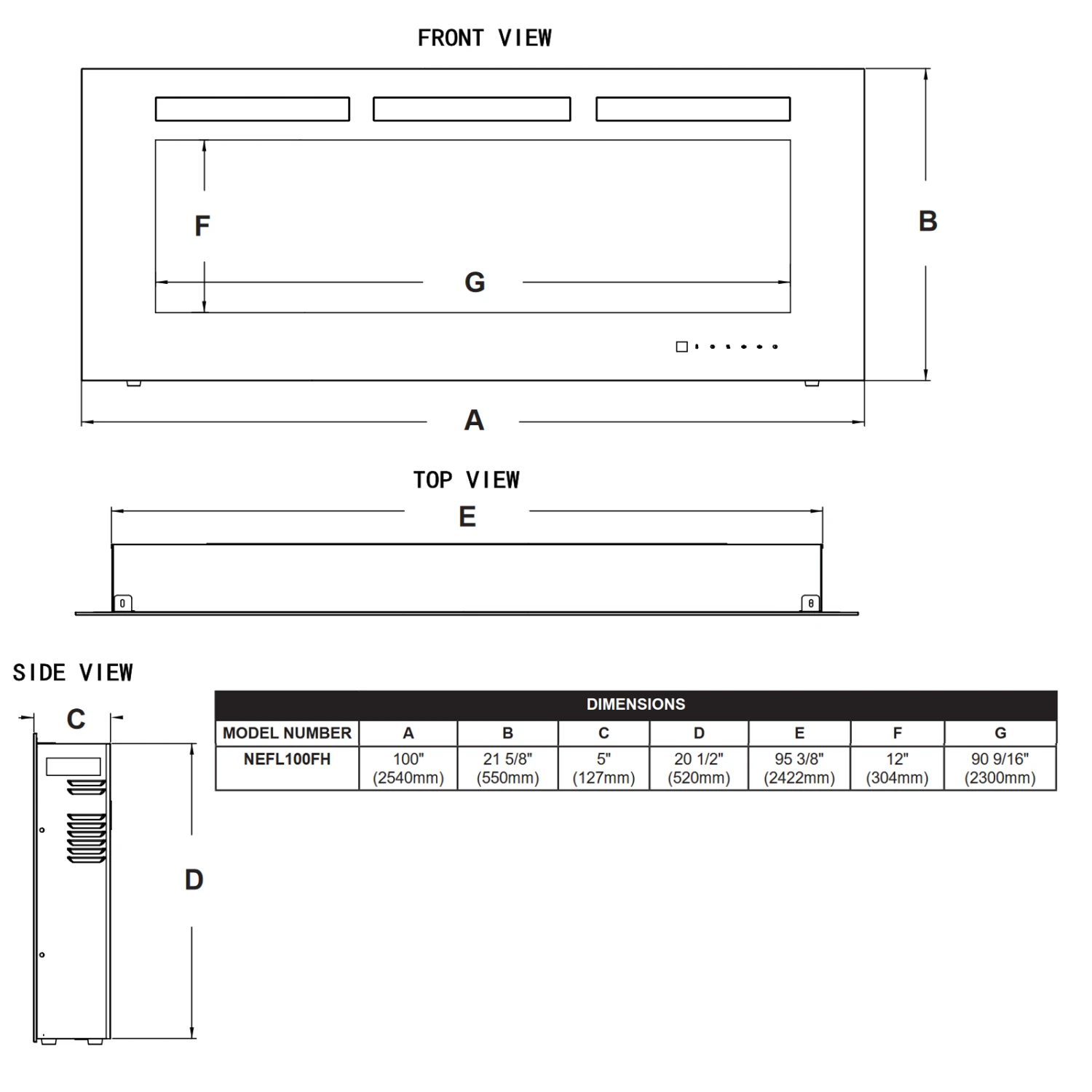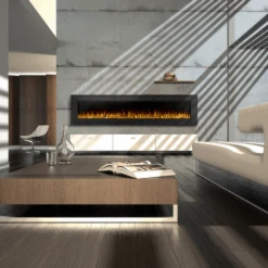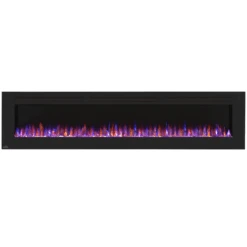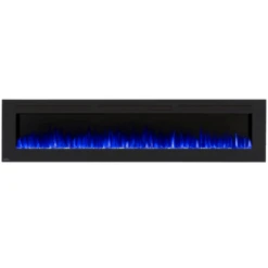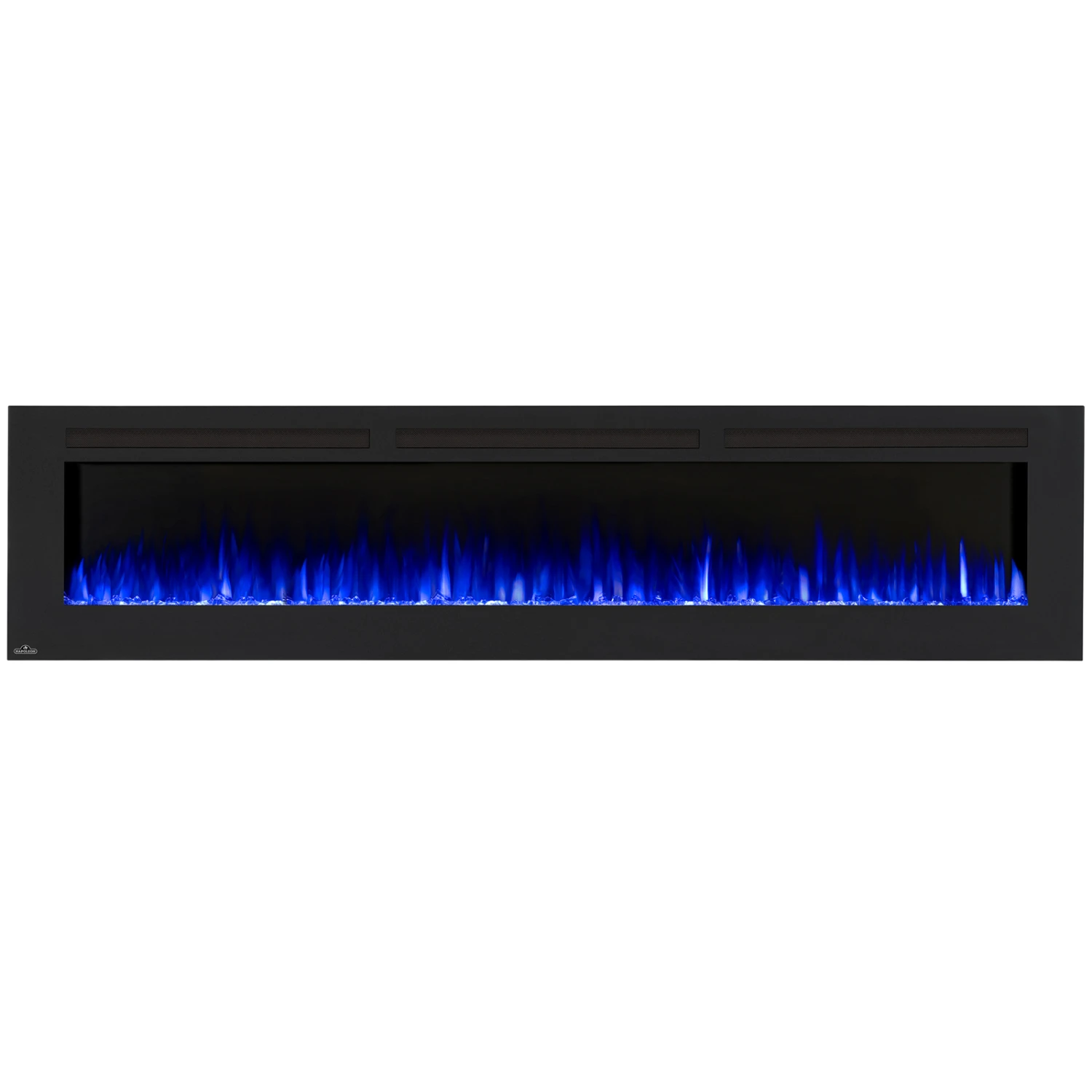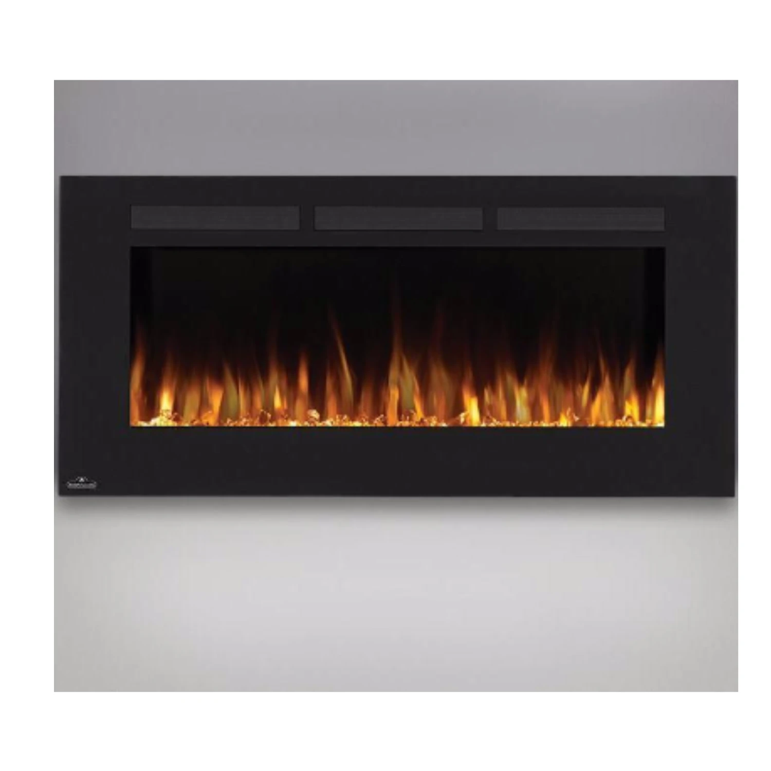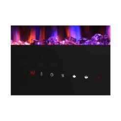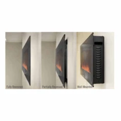 Make a statement with the Napoleon Allure 100 Electric Fireplace. This fireplace puts out an incredible 5,000 BTU’s, glittering with multicolored flames and a crystal ember bed. You don’t need a specialist or a gas fitter for this expansive beauty, just hang on the wall and plug in for instant transformation of your space. Traditional orange flames, or cool blue flames, or a combination of the two will set the mood. The 5″ depth means that this fireplace doesn’t intrude into your living space, but simply accents it with the expansive view of fire. Place this electric fireplace anywhere you want to make a huge impact, perfectly suited for either your home or a commercial setting.
