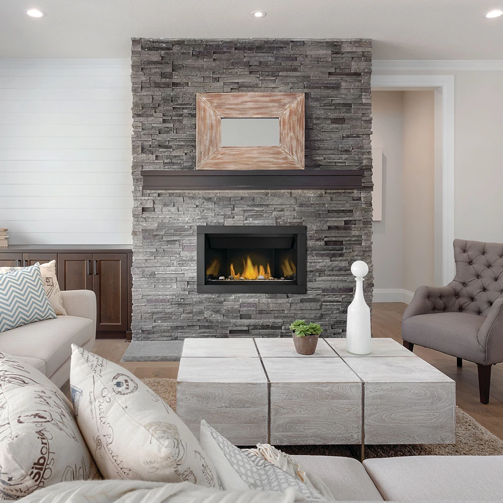The Napoleon Ascent Linear 36 Gas Fireplace is perfect for homeowners, re-modelers and custom builders. With a multitude of designer options, the Ascent Linear 36 can be dressed to match an existing room décor or can be stylized to be a focal point in your room. The Ascent Linear 36 comes standard with an exclusive Topaz crushed glass ember bed that can be changed out to a completely new look with the Shore Fire, Beach Fire and Mineral Rock kits which include a variety of rocks, sand, logs and vermiculite.