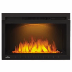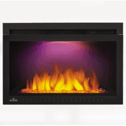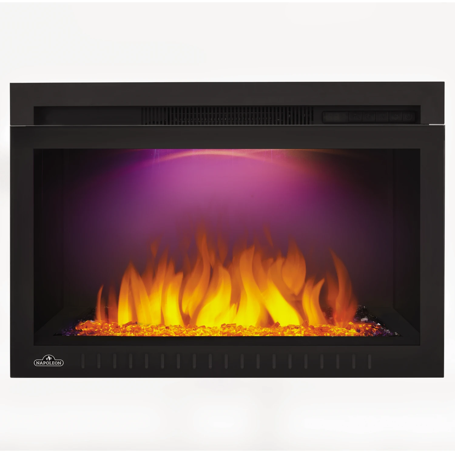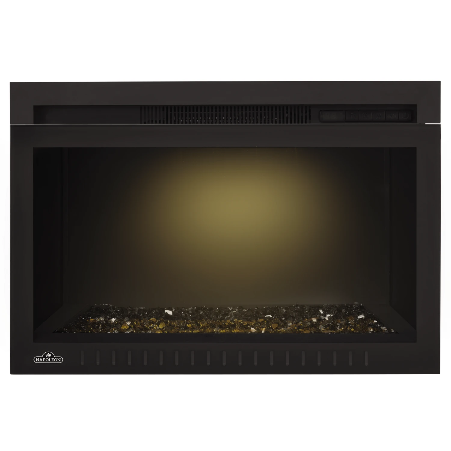 The glow from a Napoleon Cinema Glass 27 Built-In Electric Fireplace will transform any room by adding a sparkling and luxurious touch. No venting or chimneys are needed to fill your space with the warmth and glow of a Napoleon Fireplace. Add a uniquely modern touch by installing this electric fireplace directly into a wall. The topaz glass ember bed scintillates, setting the perfect mood, when lit by the flickering flames, or the unique, multicolored NIGHT LIGHT. Perfect your space with a Cinema Glass 27 Built-In Electric Fireplace.