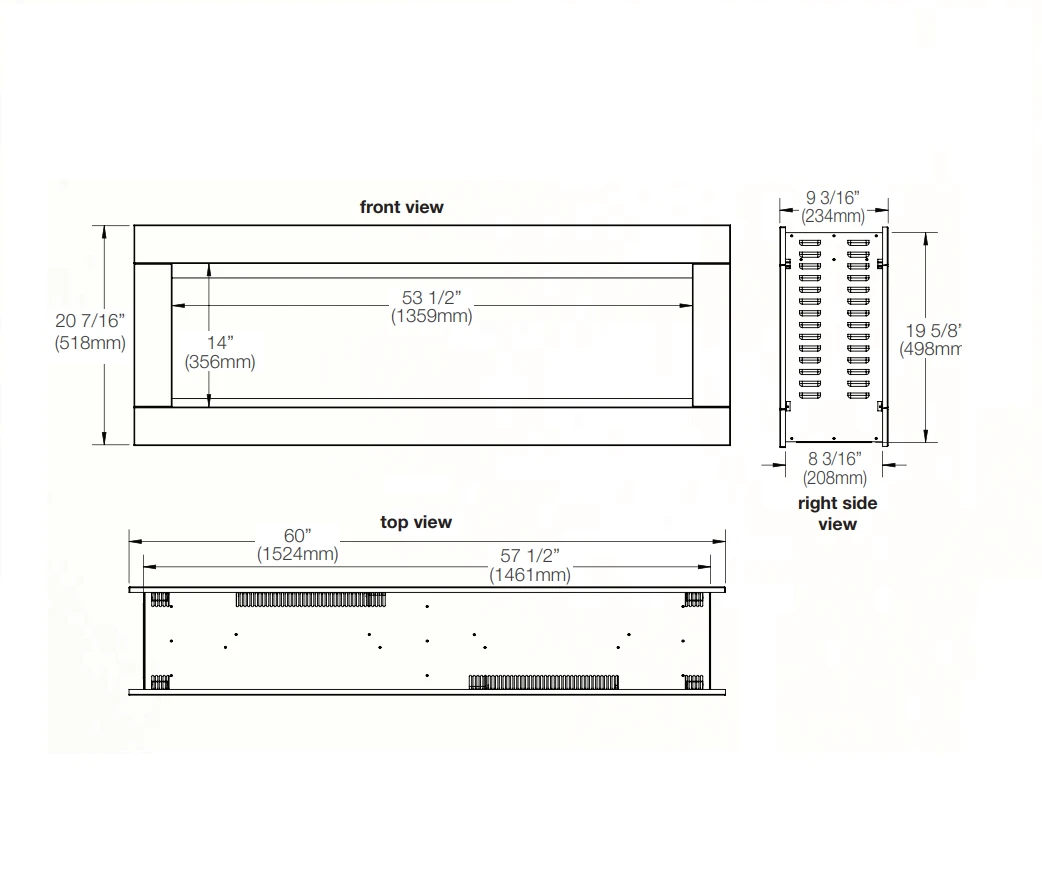 - Fireplace Viewing Area: 18 3/8″h x 53-1/2″w (per side)