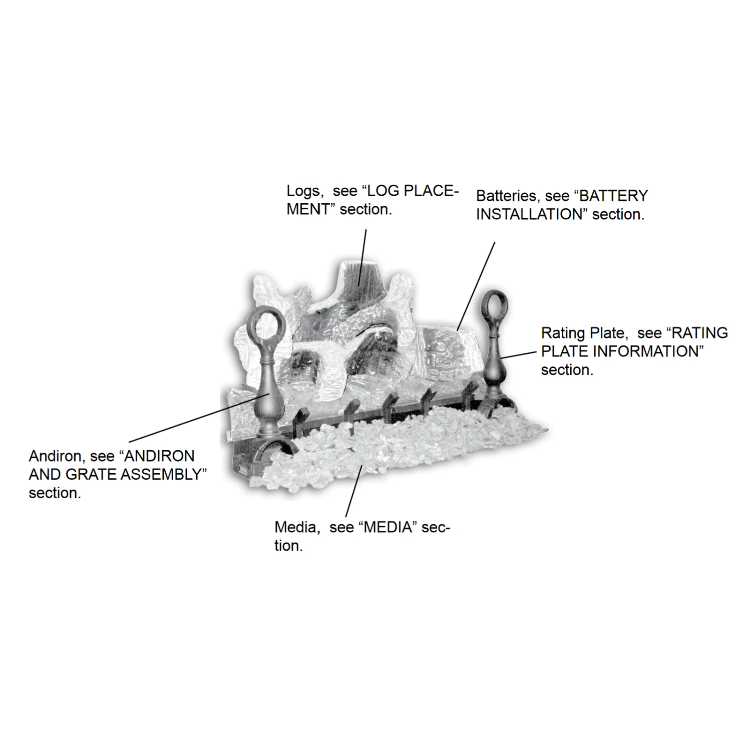 - Complete with solid cast iron andirons & grate, large charcoal embers and 5 lbs. lava rock/cinders