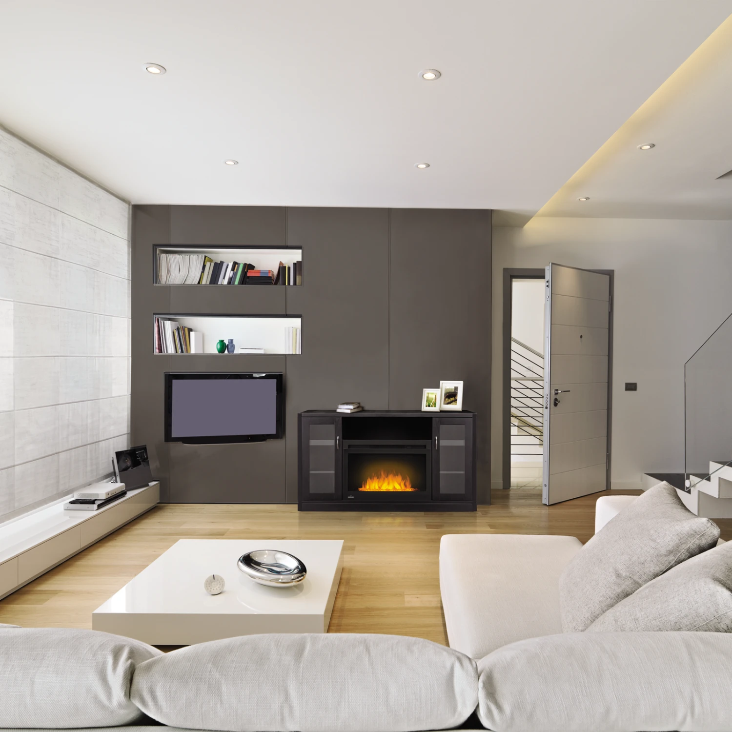 Napoleon’s Essentials Series is now offering a new modern Crawford entertainment package, complete with the stunning Cinema Glass 27 firebox. The presence of this sleek black electric fireplace entertainment unit adapts to any room style and the darkened finish really allows the CinemaGlass 27 firebox to illuminate and demand attention from anywhere in the room.