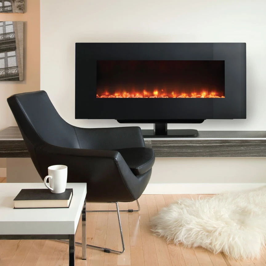 Create a distinct contemporary look. The SimpliFire 38 electric fireplace provides an instant upgrade to any space, with or without the heat. Simply hang the fireplace on the wall and plug it in. The 38 inch wall mount fireplace is perfect for smaller rooms and comes standard with multi-colored LED backlighting to accent any decor. Includes a stand for tabletop, mantel or shelf.