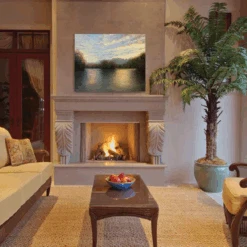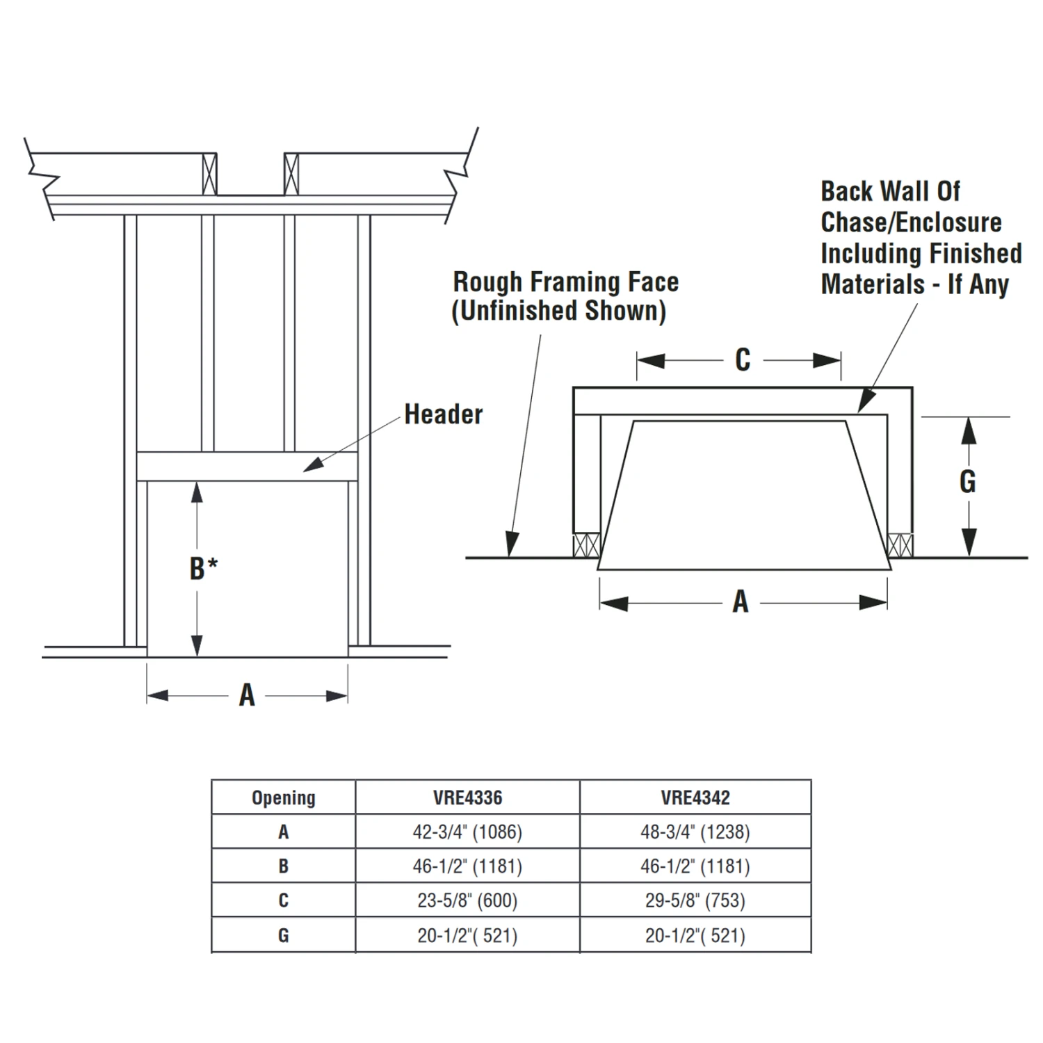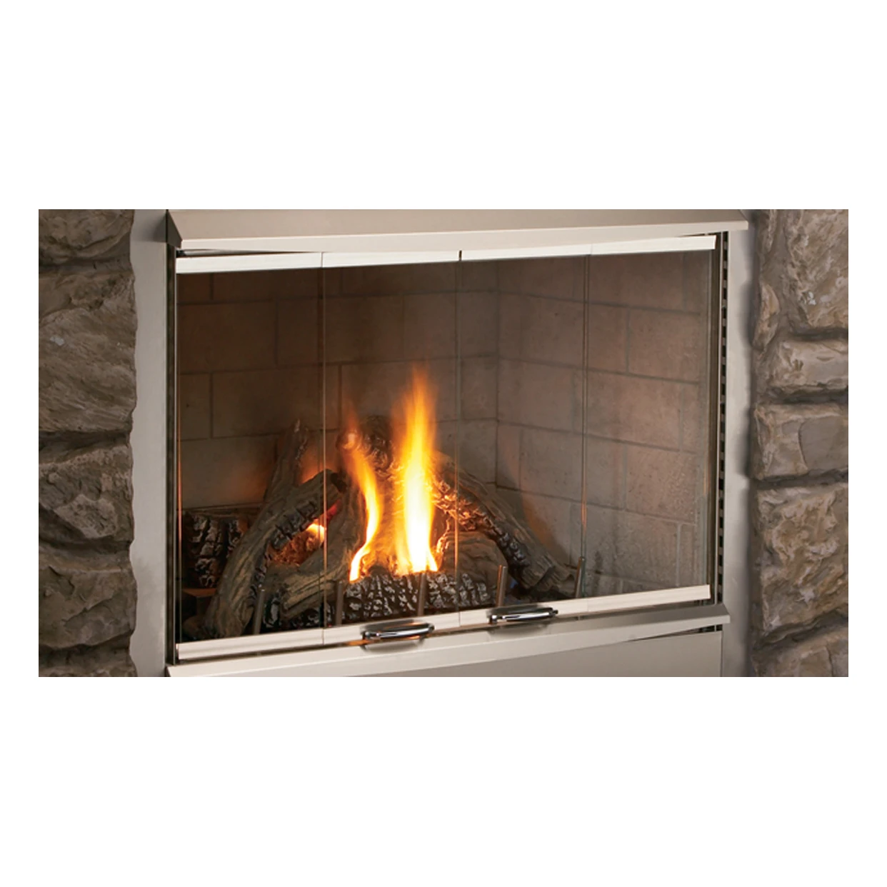 The VRE4336 is a ventless outdoor gas fireplace that is made of stainless steel and has a contemporary design. The fireplace features a charred oak campfire-style log set, a vertical aspect glass enclosure panel, and a battery-operated intermittent ignition. It has a BTU output of 50,000 and can be used with either natural gas or liquid propane.