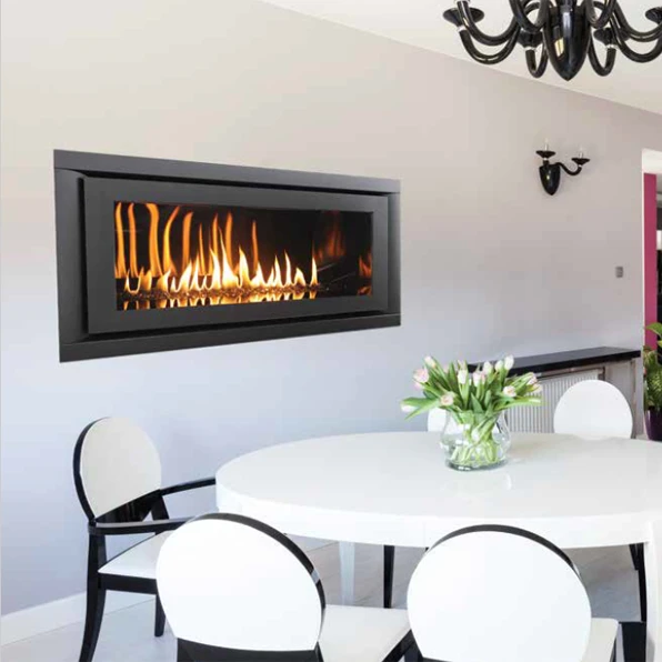 Linear in design and stunningly multifaceted in effect, the DRL6554 offers a sophisticated, energy-efficient and easy-to-install heating option for any installation that wants a modern feel. Its expansive viewing area showcases a continuous band of dramatic, wavering flames that’s enhanced by a porcelain interior and reflective black crushed glass media. A choice of finishes adds to the beauty of the fireplace and its long, tall elegant flames.