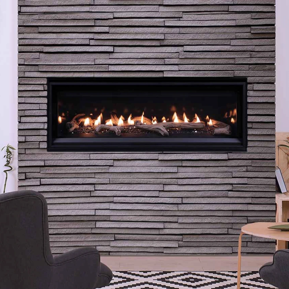 The DRL2055 linear direct vent gas fireplace offers a clean faced, low profile design that is just right for contemporary and transitional spaces. Its sleek opening provides an exceptional view of the gently dancing flames rising through the beautiful reflective black glass floor media. Reflective black porcelain interior liner, heat circulating blower, remote and wall controls are available as optional accessories, making the DRL2055 a smart choice.