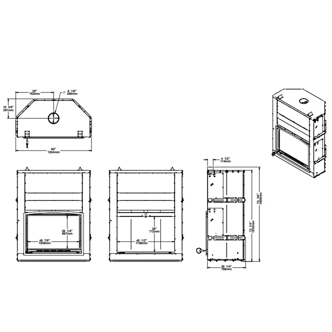 The Frontenac wood fireplace blends elegance with modernity, boasting a minimalist sleek faceplate and a large 972 in² glass for stunning flame views. Its guillotine-style door and fire screen system ensure seamless use with a discreet, easy-access mechanism. Compliant with Phase II EPA standards, it emits 70% fewer particles than uncertified fireplaces, offering a clean, cozy atmosphere without sacrificing air quality.