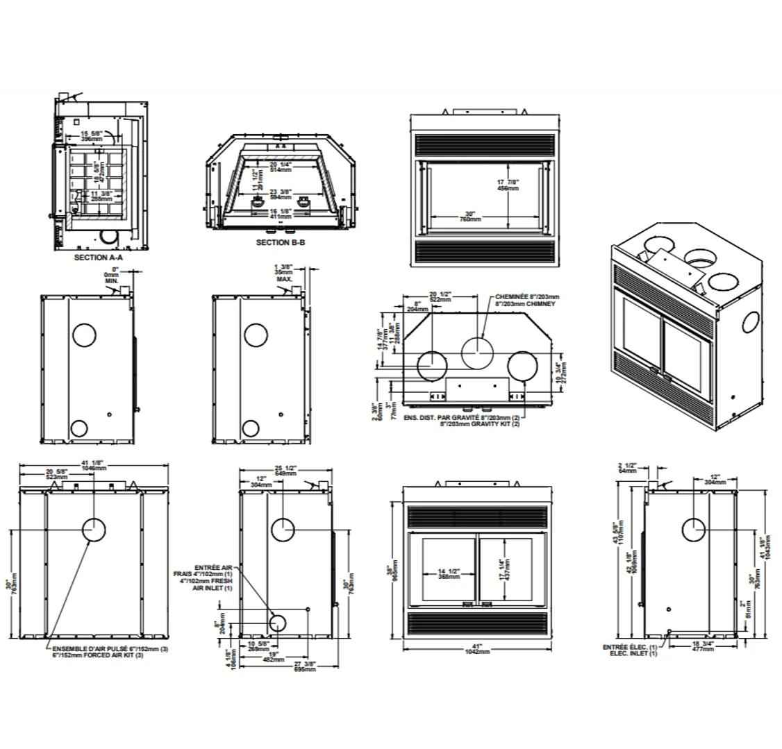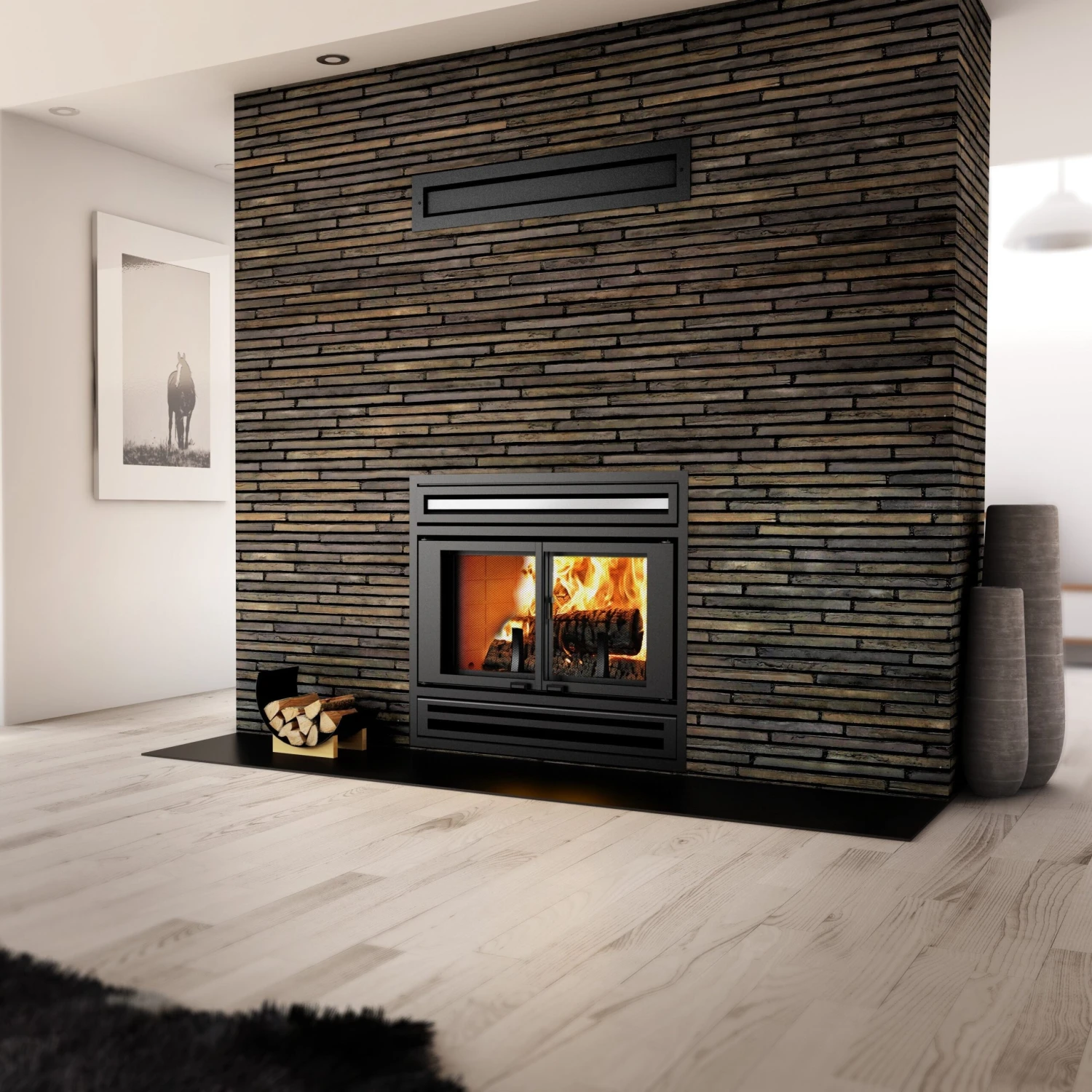 The Manoir, an updated version of Valcourt’s original fireplace, combines classic charm with modern functionality. Its steel-framed double doors and ceramic glass provide unmatched quality, sliding effortlessly for an exceptional view of the flames. This fireplace not only enhances your decor with various facade finishes but also maximizes heating efficiency with its included fan and versatile heat distribution options (forced air or gravity), ensuring comfort and style in your living space.